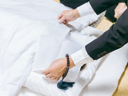 病院や警察などからのお迎え後、ご希望の場所に故人様をご安置いたします。付き添い安置をご希望の方は弊社の式場をご利用できますので何なりとお申し付け下さい。提携斎場一覧はこちら
