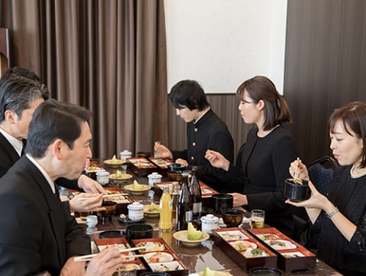 どのタイミングで行うかはお寺の考えによります。火葬場から戻り、献杯の後、精進落としでお食事を召し上がっていただきます。通夜時とは異なり、一人一膳の形式が主流です。